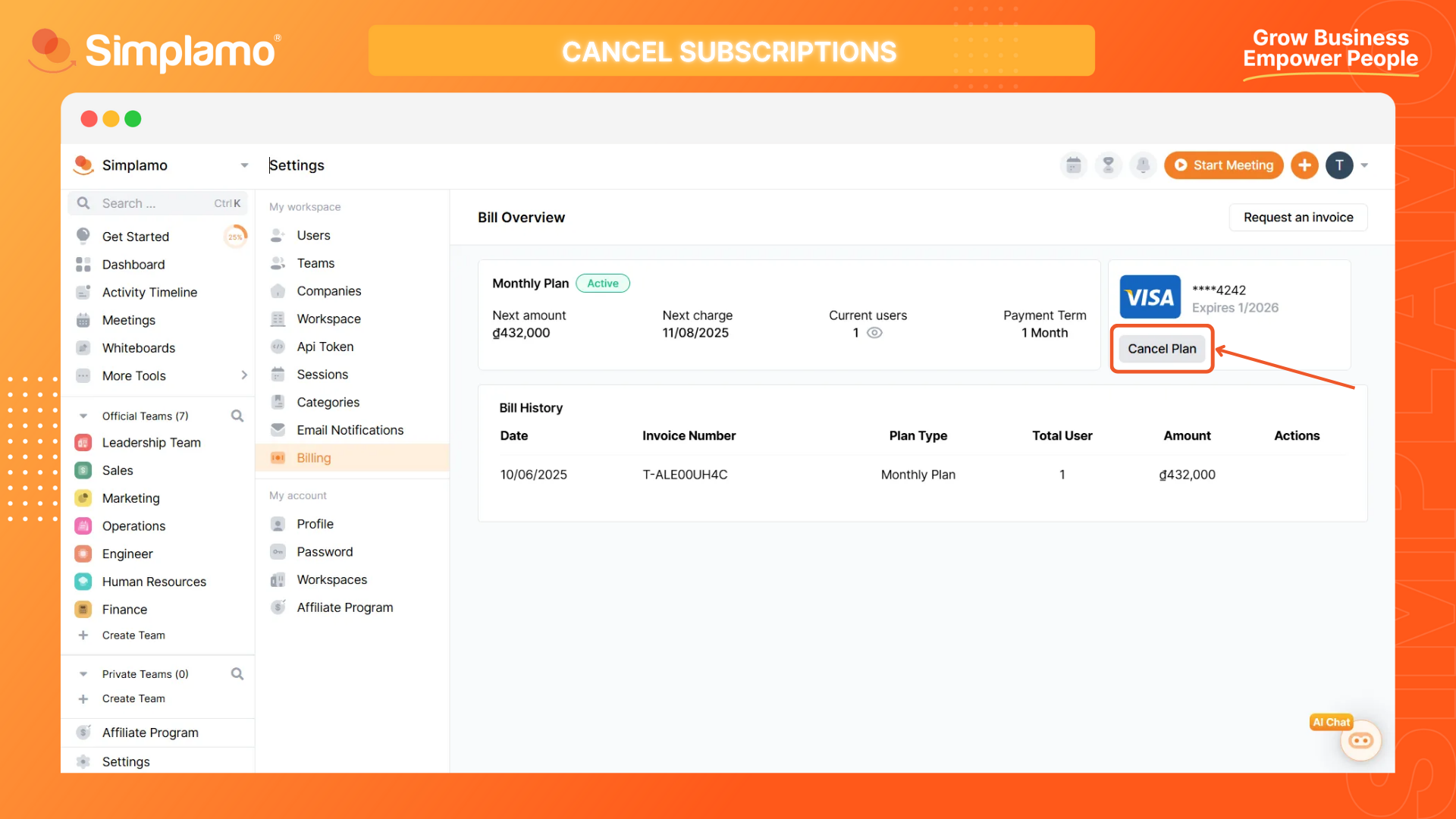 On the Billing page, you can choose to cancel your current service subscription. Once unsubscribed, you will no longer receive system expiration notifications when the payment due date approaches. Additionally, if you have saved a credit card for automatic payments, this recurring charge will also be stopped.