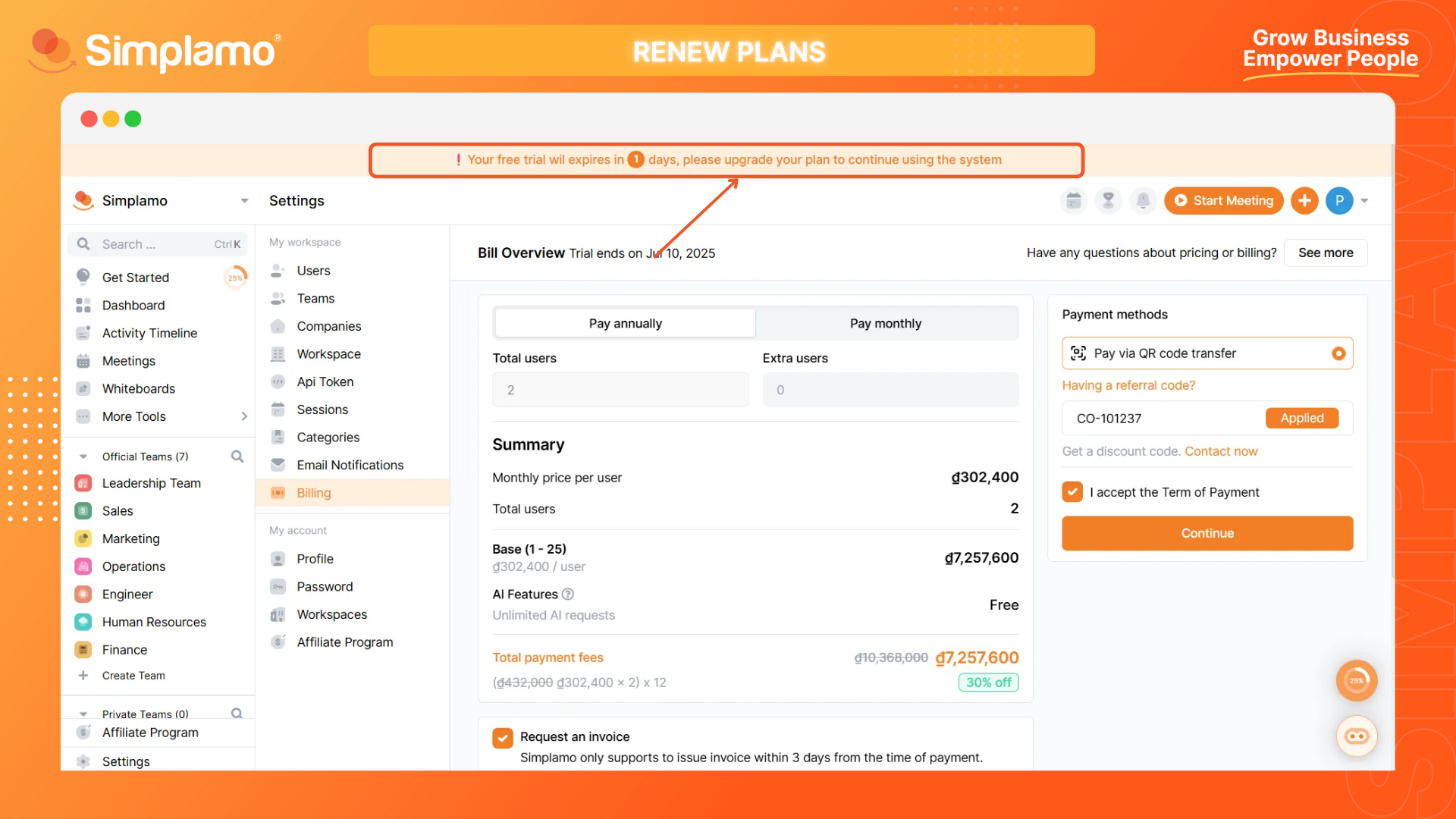 When the service renewal period is approaching, the system will send you notifications via email and in-workspace reminders. Depending on the service plan and payment method you are currently using, the system will support different renewal methods: