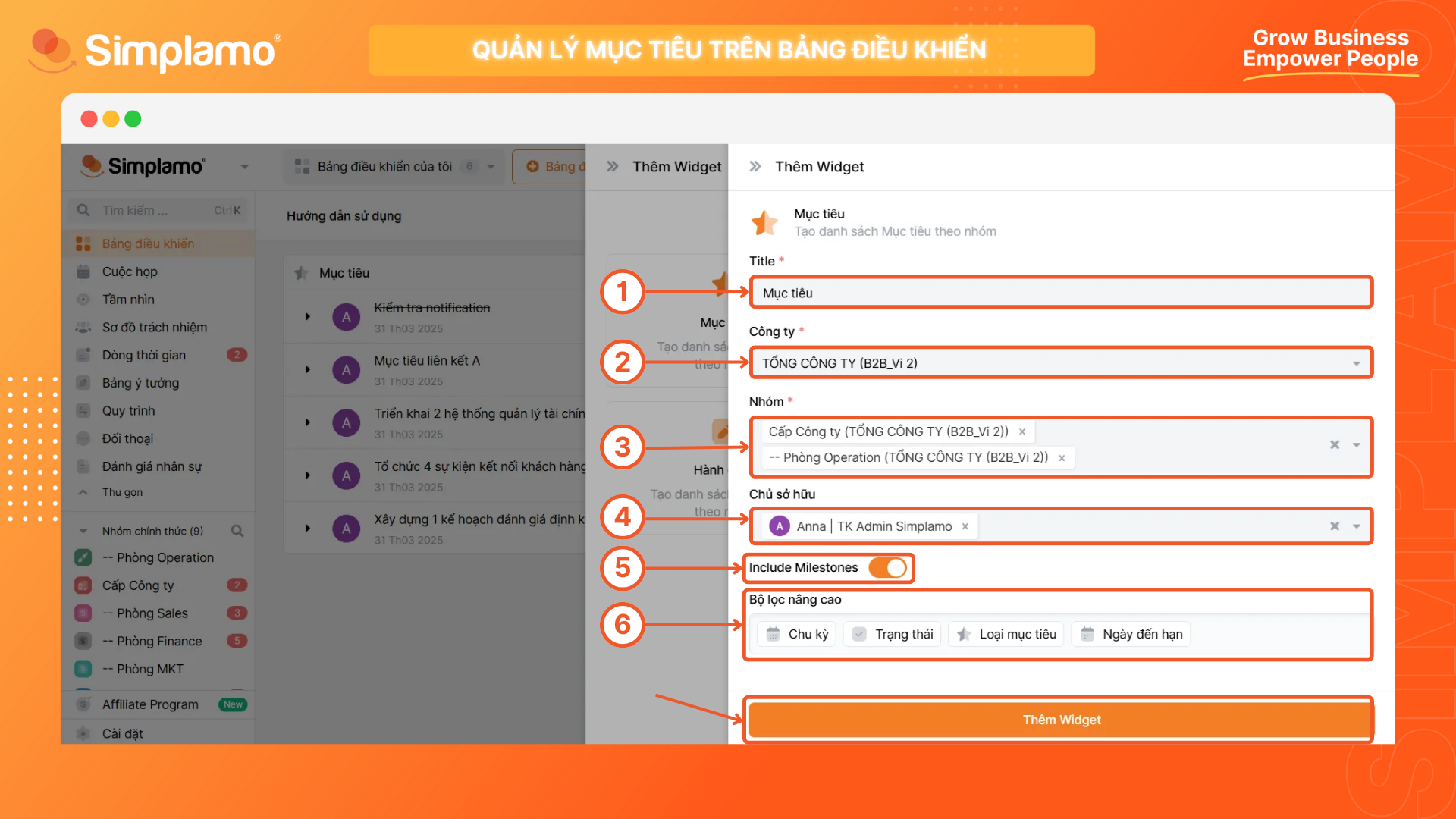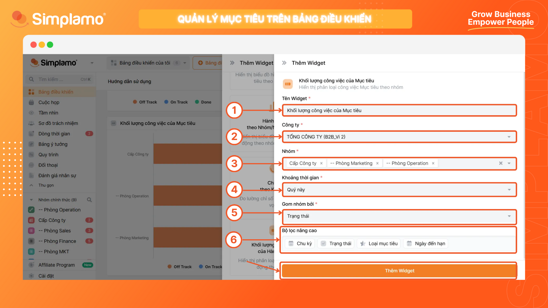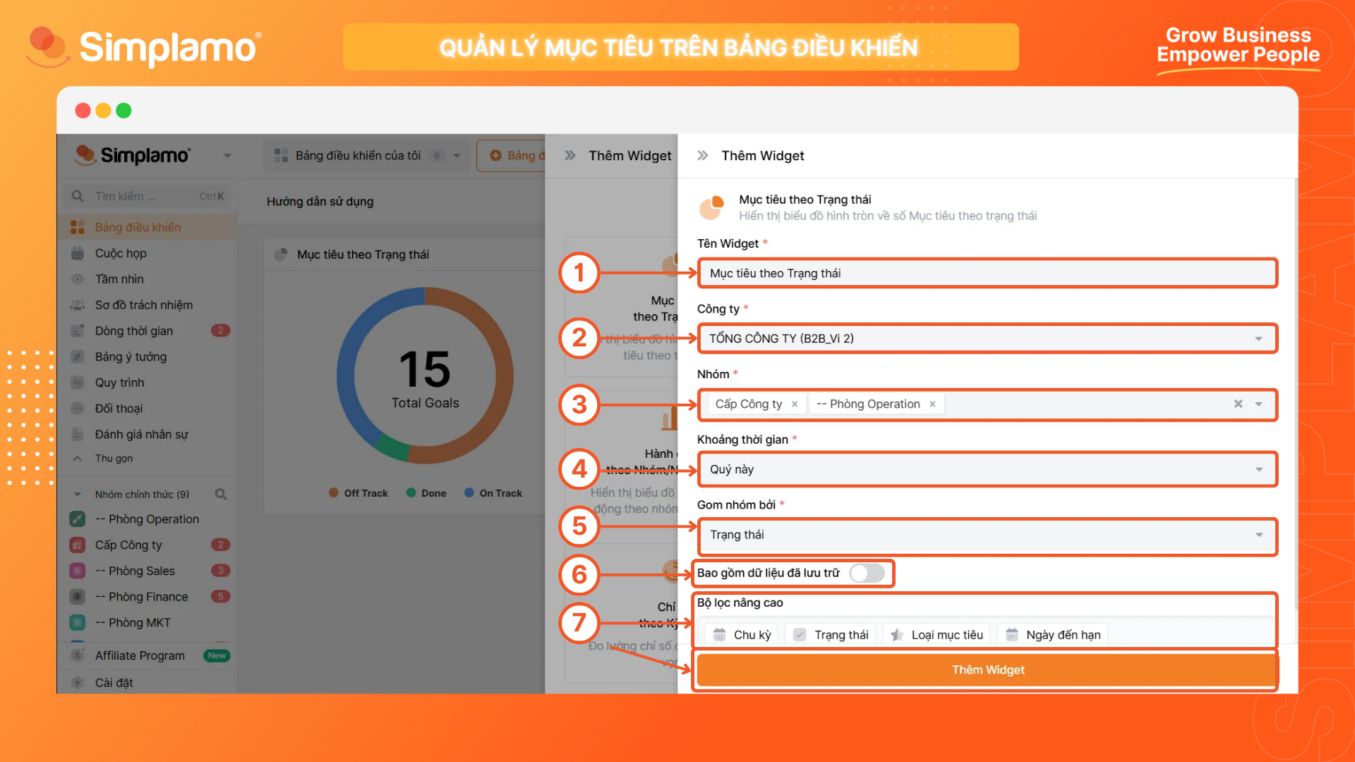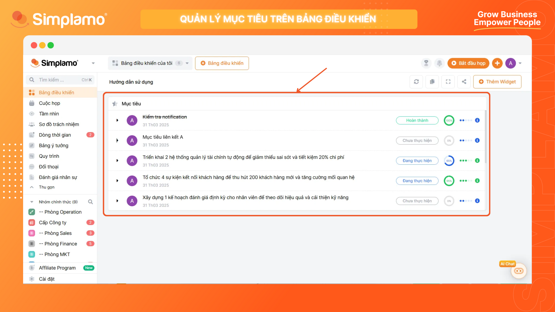 Sau khi tinh chỉnh thông tin thiết lập xong, hãy chọn Thêm Widget để thấy bảng danh sách mục tiêu tương ứng được thêm vào hệ thống.