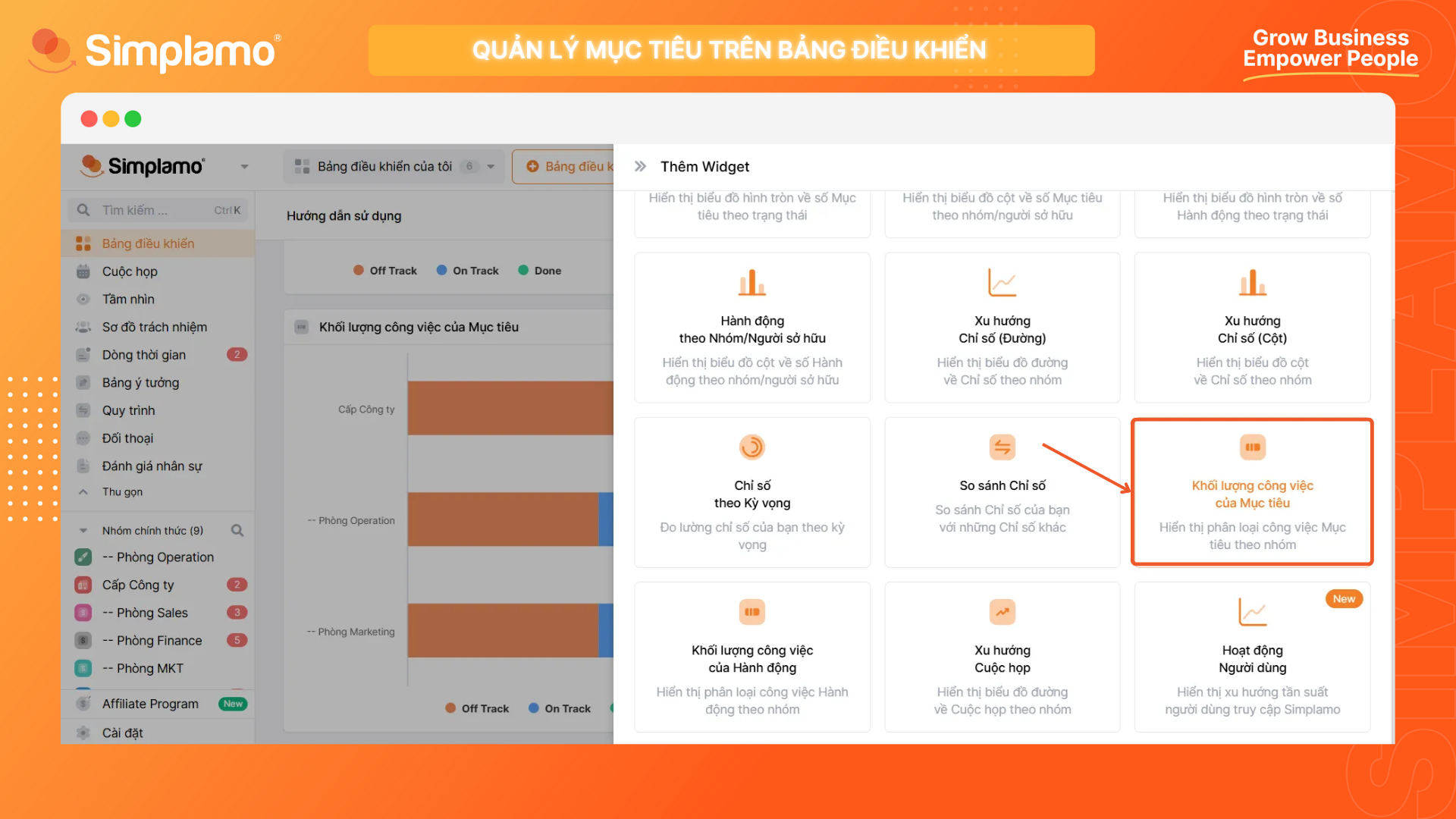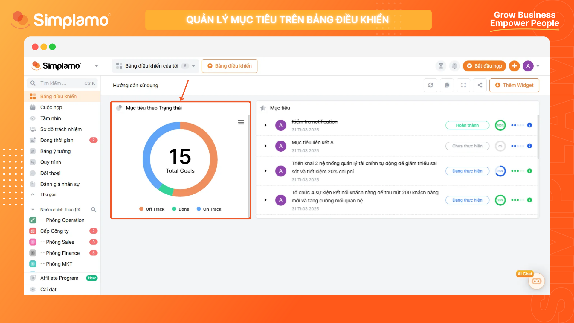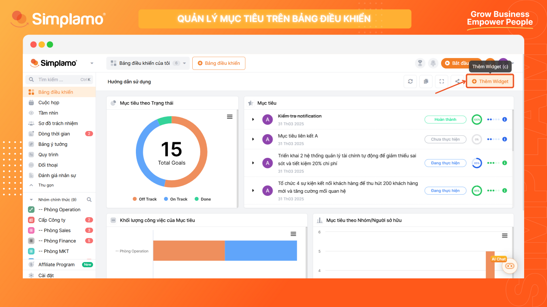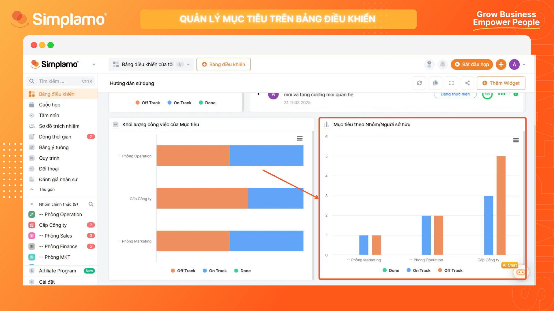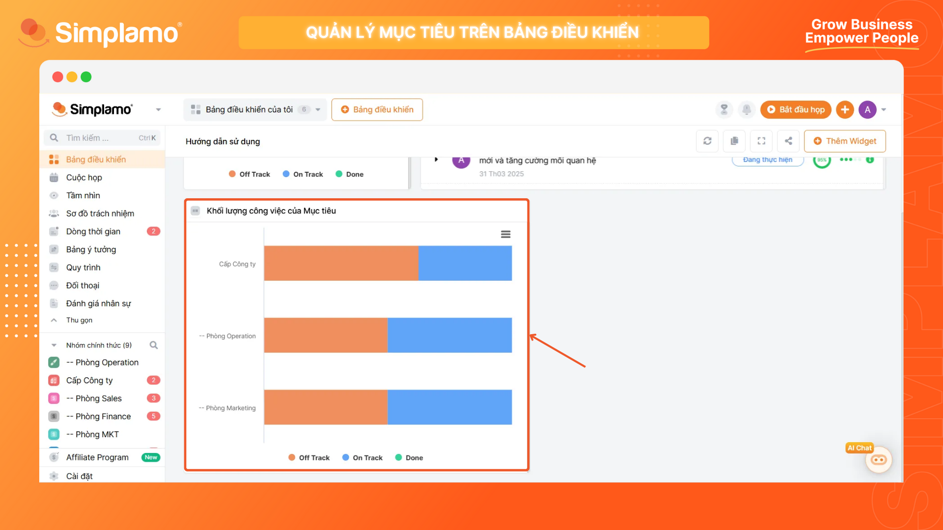 Widget này cho phép bạn nhìn nhanh tình hình thực thi mục tiêu giữa các bộ phận hoặc từng nhân viên với nhau. Bạn sẽ thấy mỗi bộ phận/cá nhân đang có bao nhiêu mục tiêu đã xong ✅, đang làm 🛠️ và đang trễ hạn ⏳, cùng với tỉ trọng giữa 3 loại mục tiêu đó ở mỗi phòng ban/cá nhân ra sao. Widget này phù hợp cho việc: