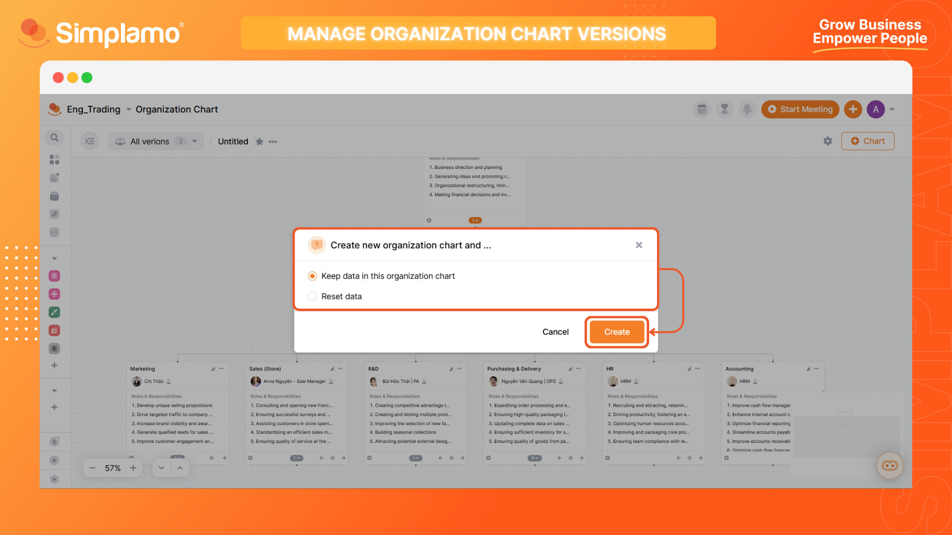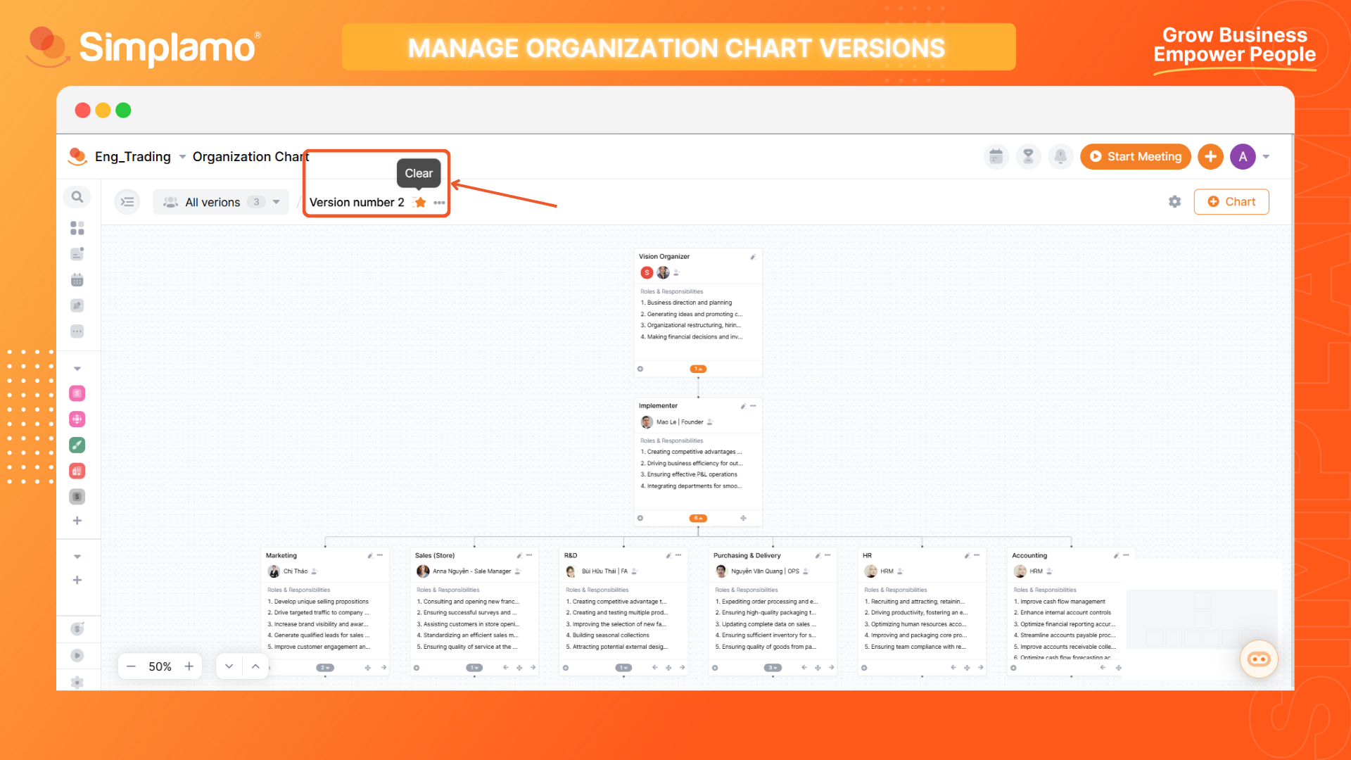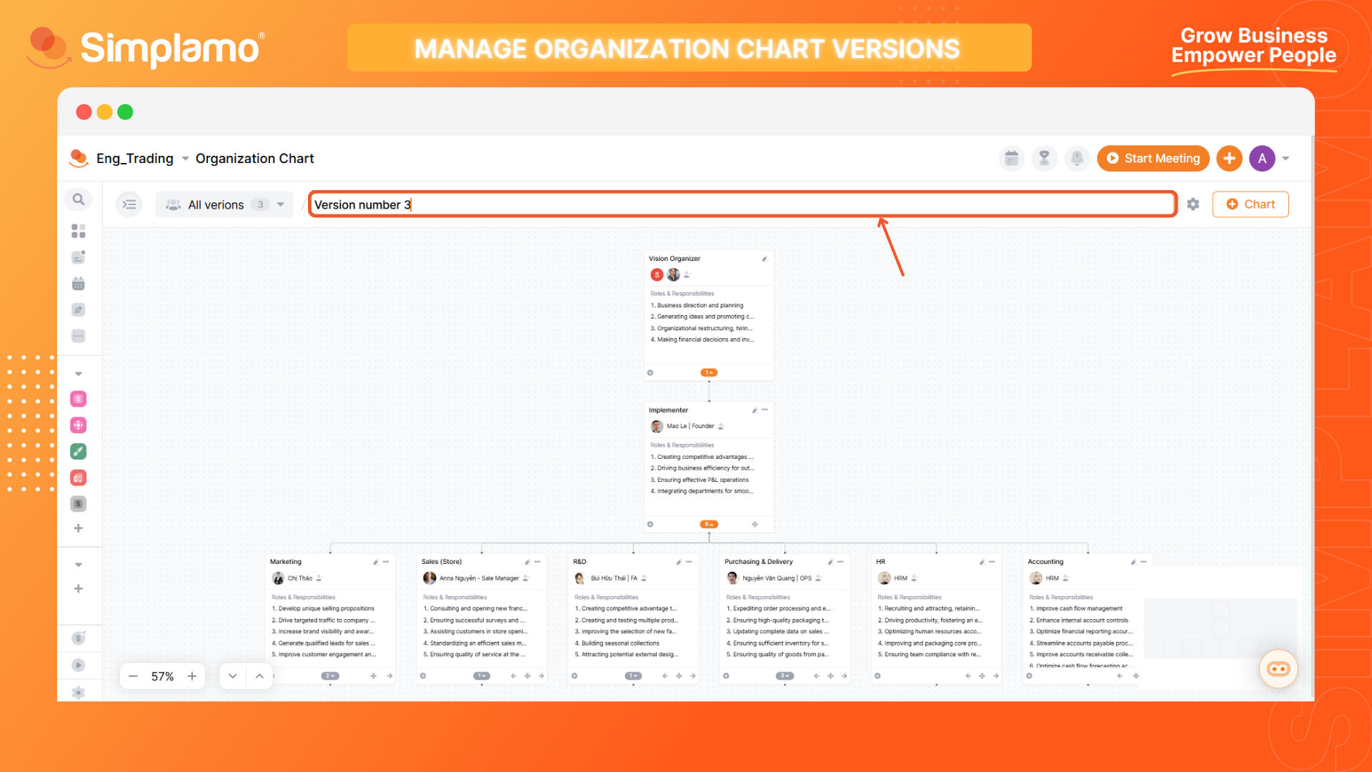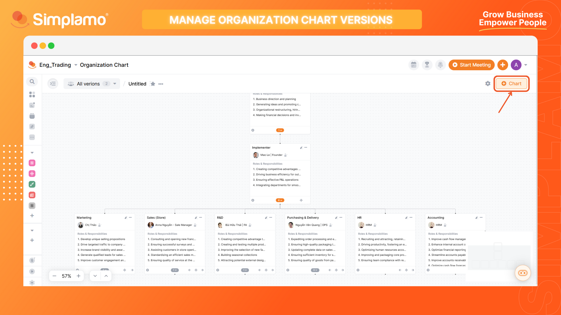 Simplamo allows you to create multiple Accountability Charts simultaneously to compare and calculate the best fit version for your organization. Here are 03 steps for you to create multiple Accountability Chart versions: Step 1: To add an Accountability Chart, select (+) Chart in your Accountability Chart screen.