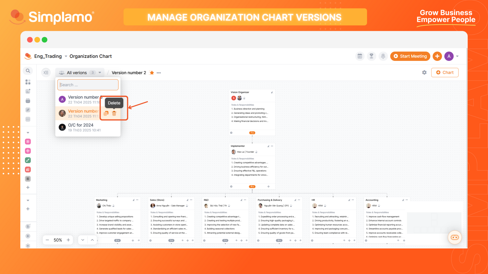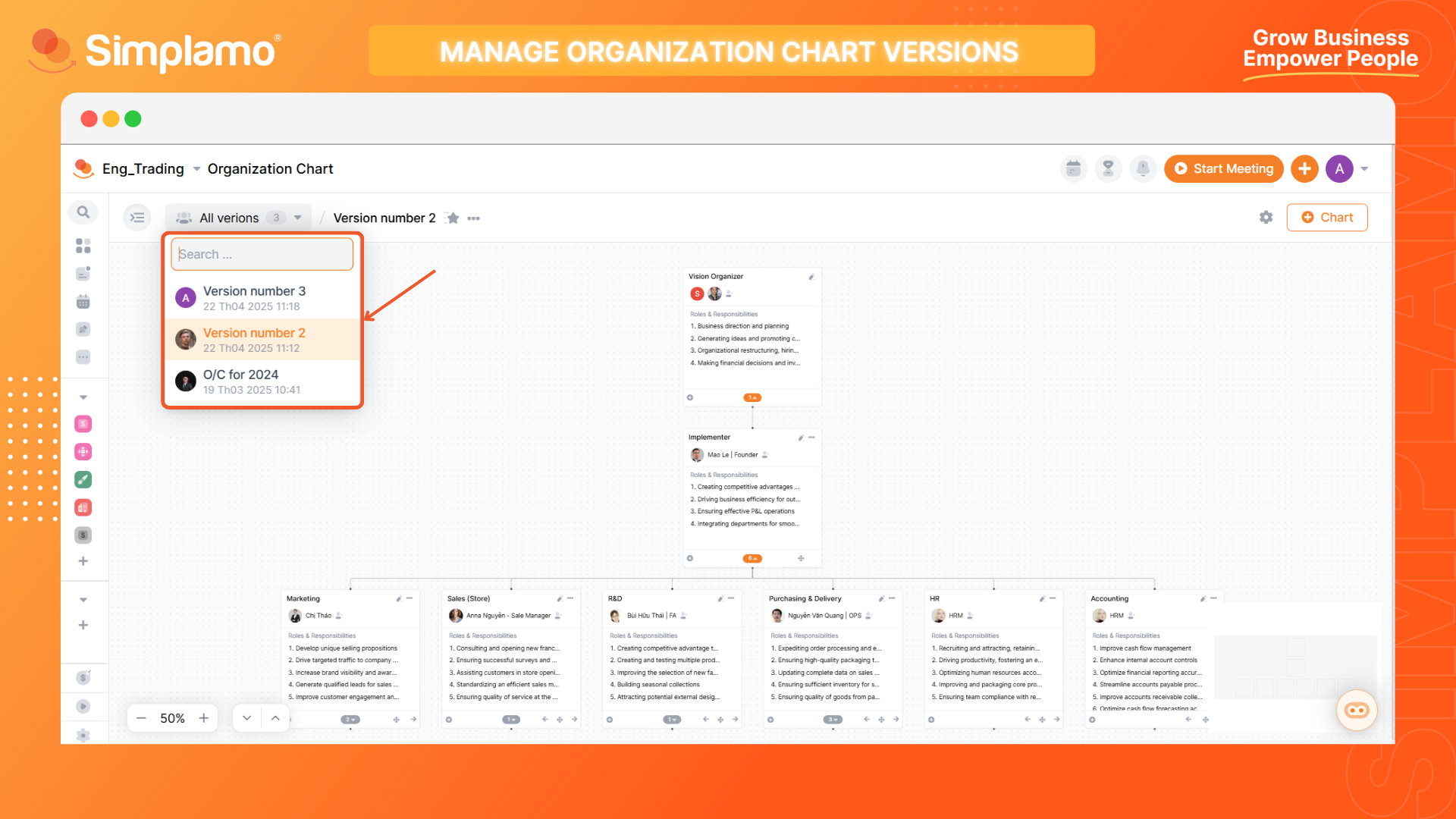 You can navigate back and forth between the Accountability Chart versions you have created. Select the dropdown icon to see all available Chart versions. Then click to select the version you want to view.