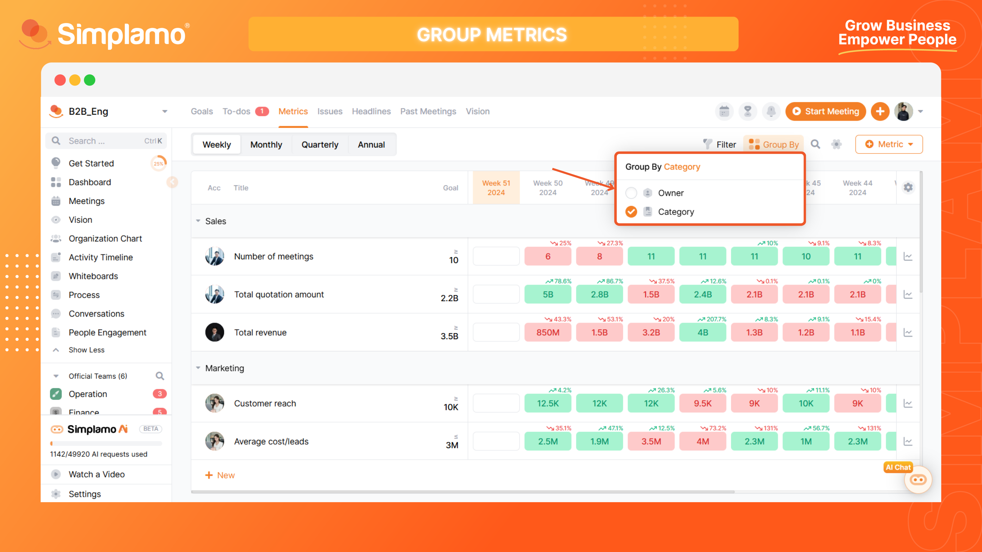 Step 2: Choose how to group your metrics. In the filter interface, you can group metrics in two ways: