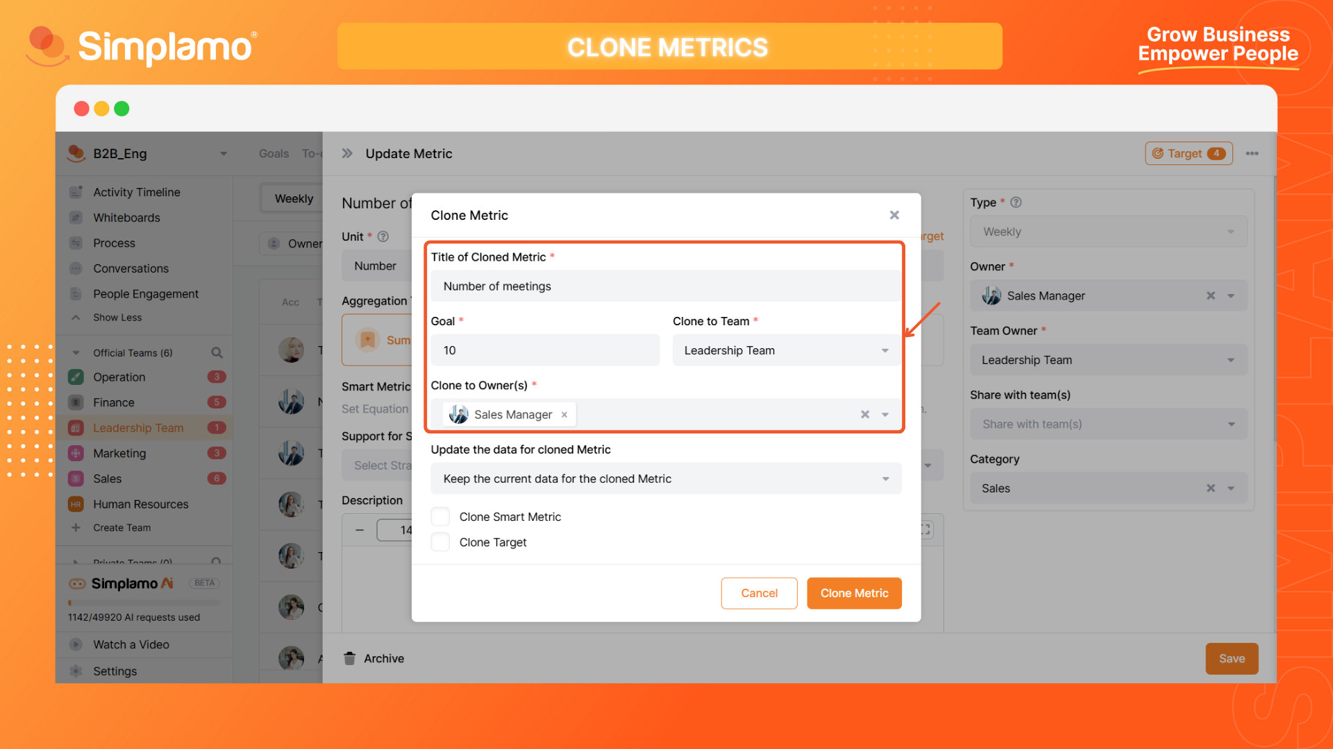 If you want to clone a "Smart Metric" or "Expectation", you can check the box in the cloning screen. Finally, click the "Clone Metric" button to complete the cloning process.