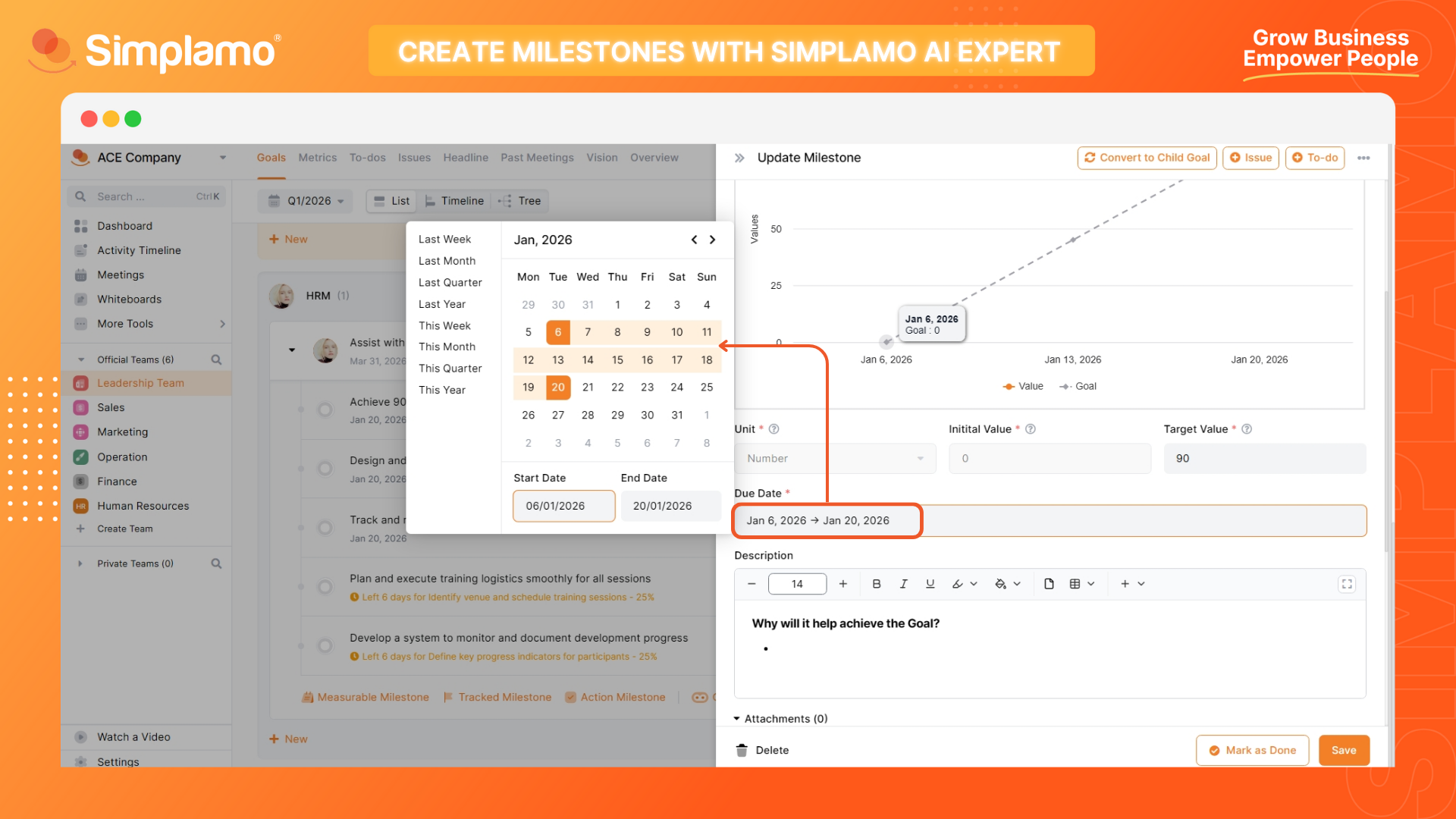 Progress milestones are an indispensable element when setting goals because they bring clarity, measurability 📊, and practicality 🛠️. In Simplamo, integrating milestones into goals also helps simplify management and optimize work results 🚀.