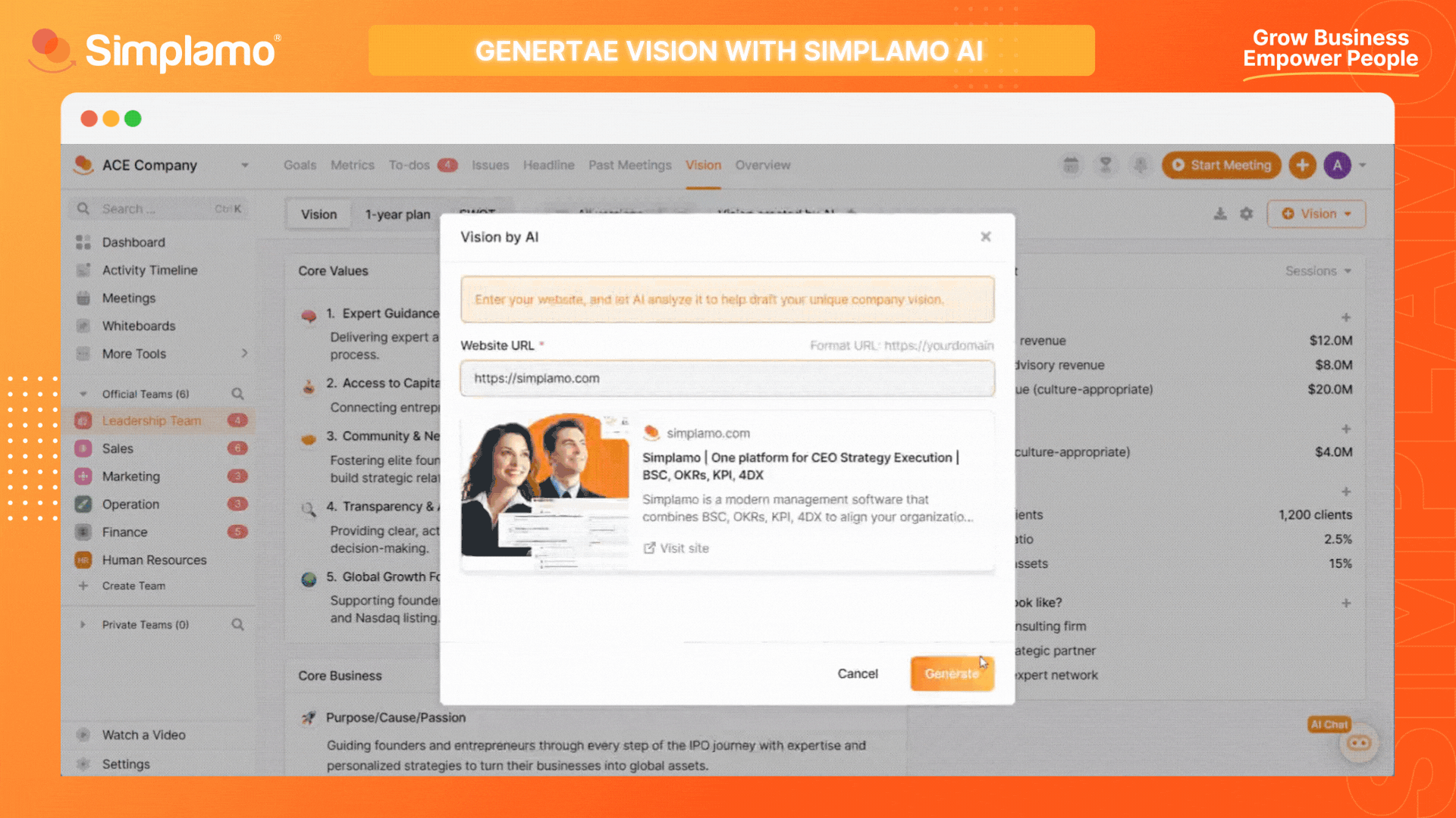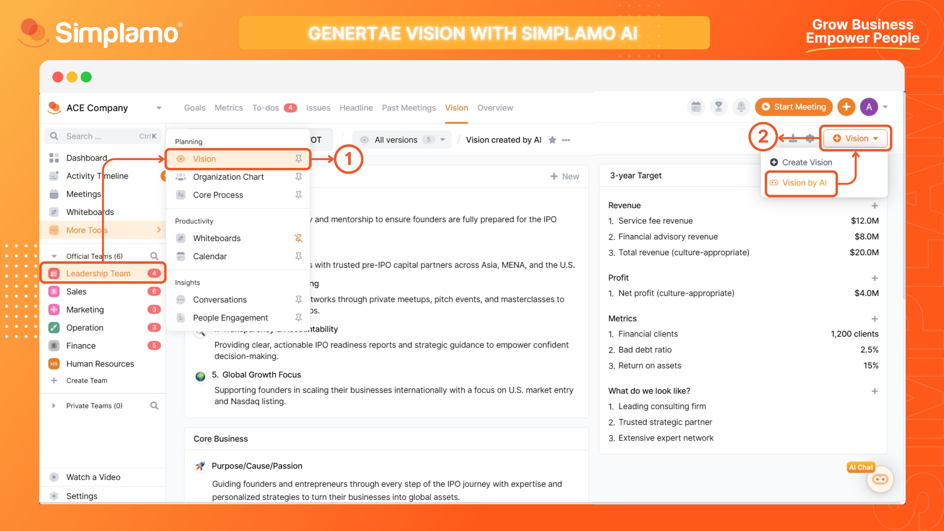 Step 3: Review the newly created Vision Page. The Simplamo AI Expert will assist you in analyzing the SWOT and Company Vision information, such as Core Values, 10-Year Target, Niche, Marketing Strategy, etc.