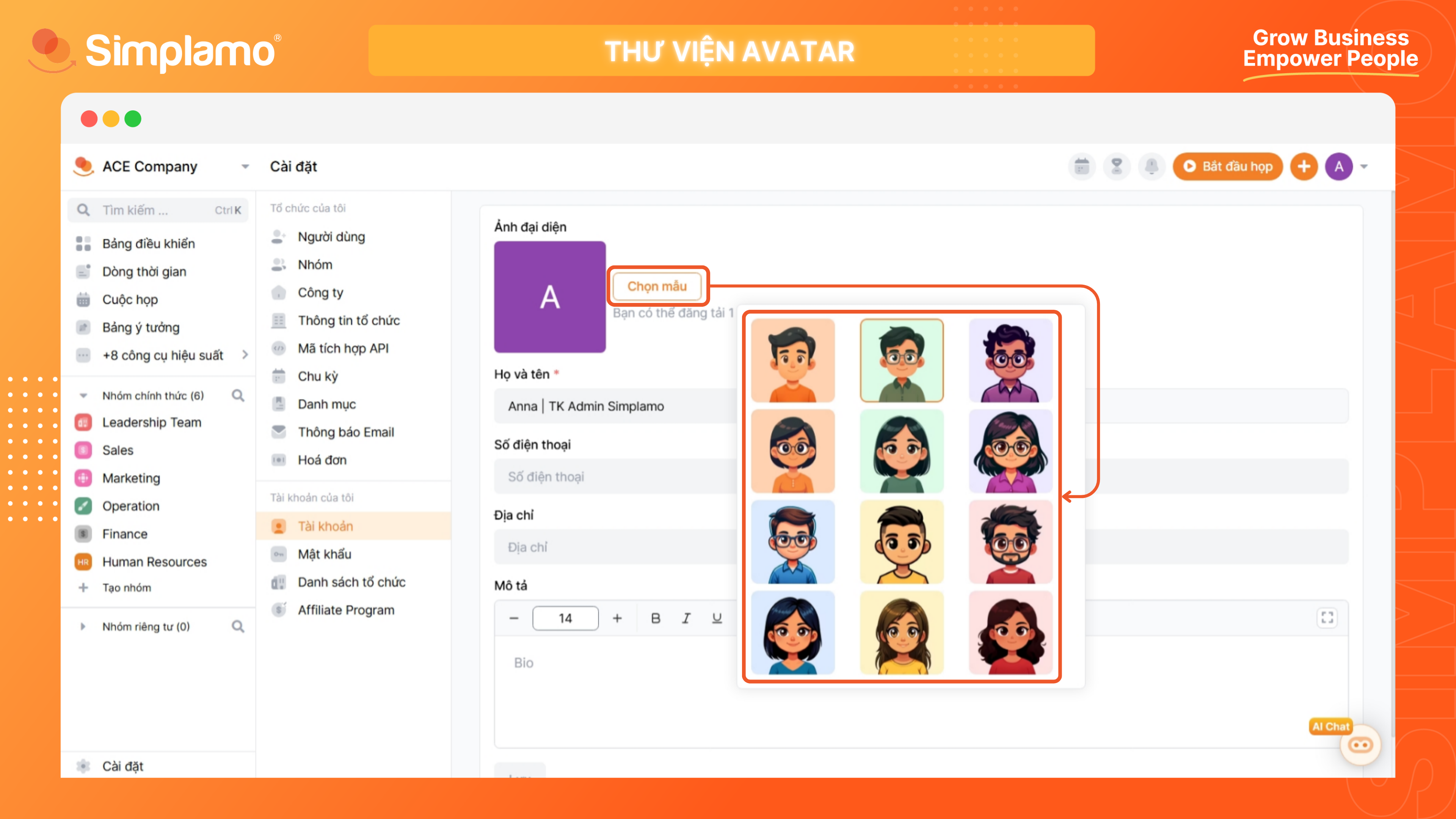 Simplamo khuyến khích người dùng đổi ảnh đại diện – việc này giúp tạo ra một hệ thống thật và sinh động cho không gian làm việc của Công ty bạn.