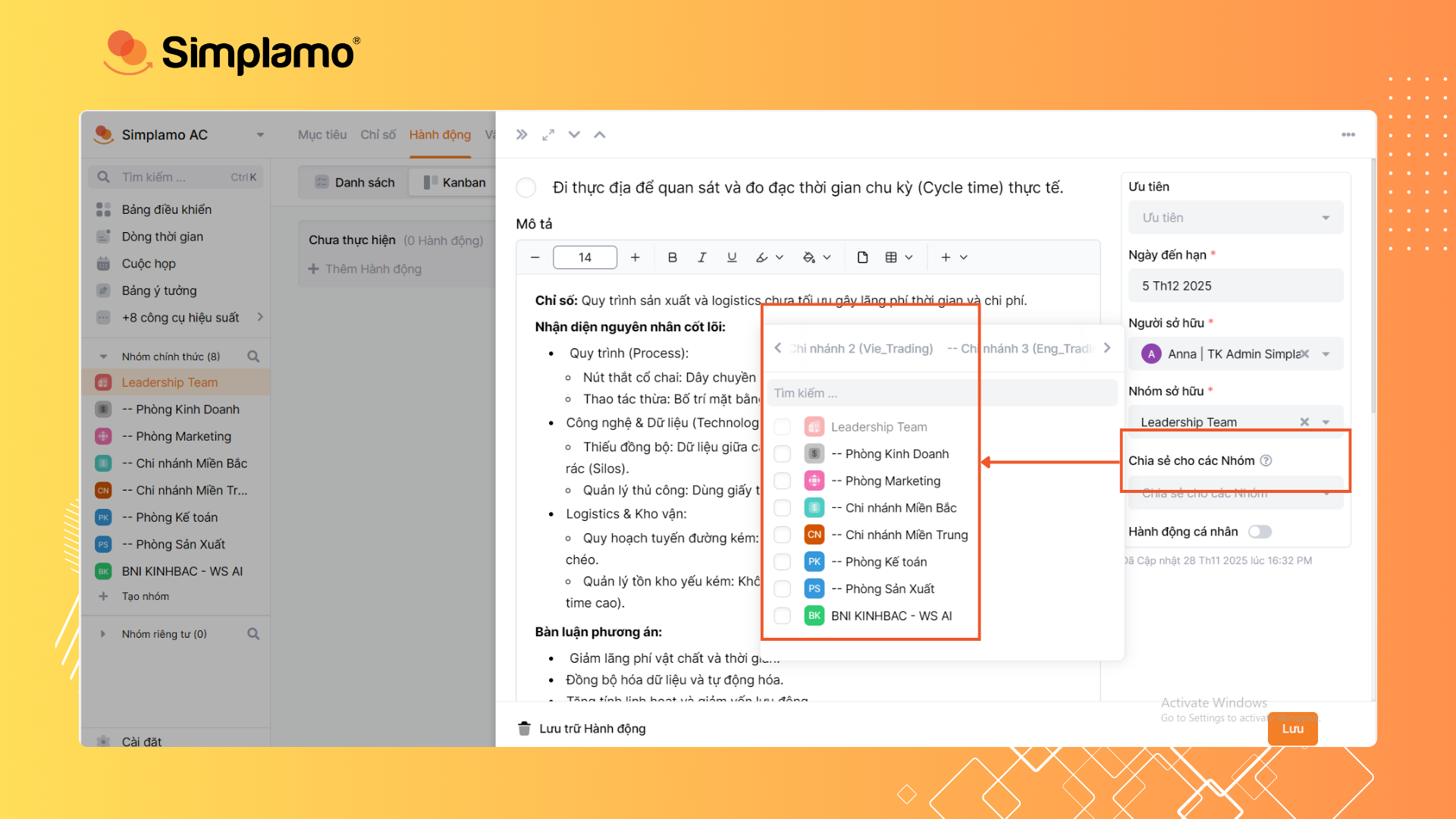 Hỗ trợ chia sẻ các nhóm công việc/đầu mục và cung cấp công cụ sắp xếp linh hoạt.